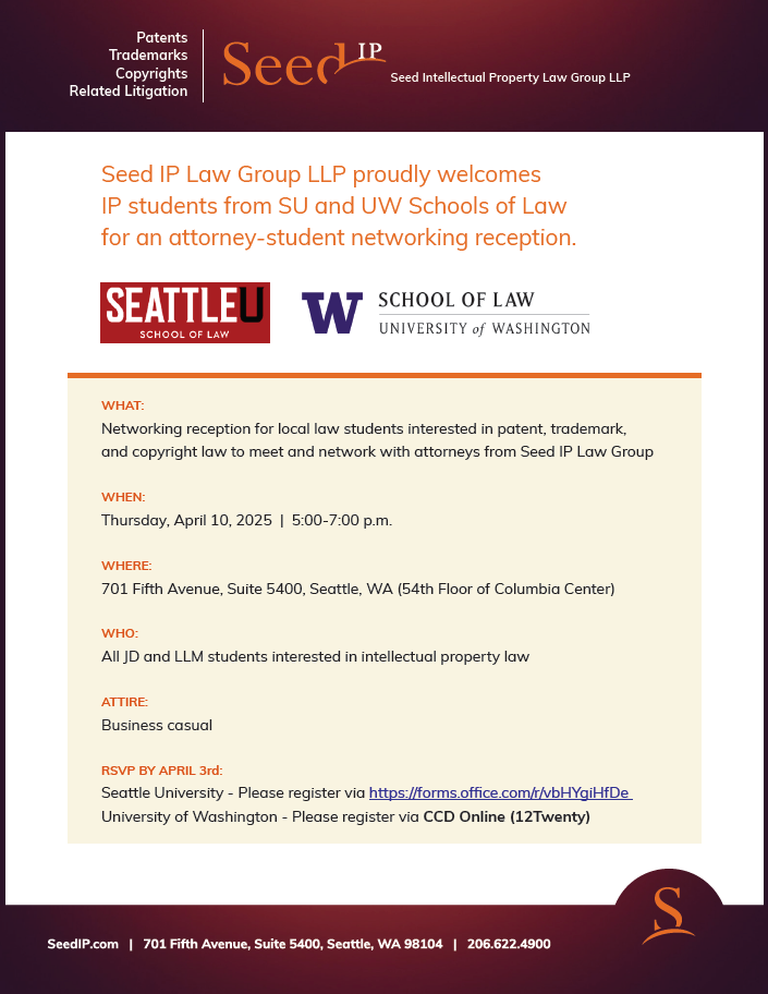 Seed IP Law Group will be hosting its annual Attorney-Student Networking Reception on Thursday, April 10, from 5:00-7:00 p.m. The reception, to be held at the office of Seed IP, is designed for local JD and LLM law students who are interested in patent, trademark, and copyright law to meet and network with attorneys from Seed IP Law Group. Students and faculty from Seattle University School of Law and University of Washington School of Law have regularly attended this annual networking event.